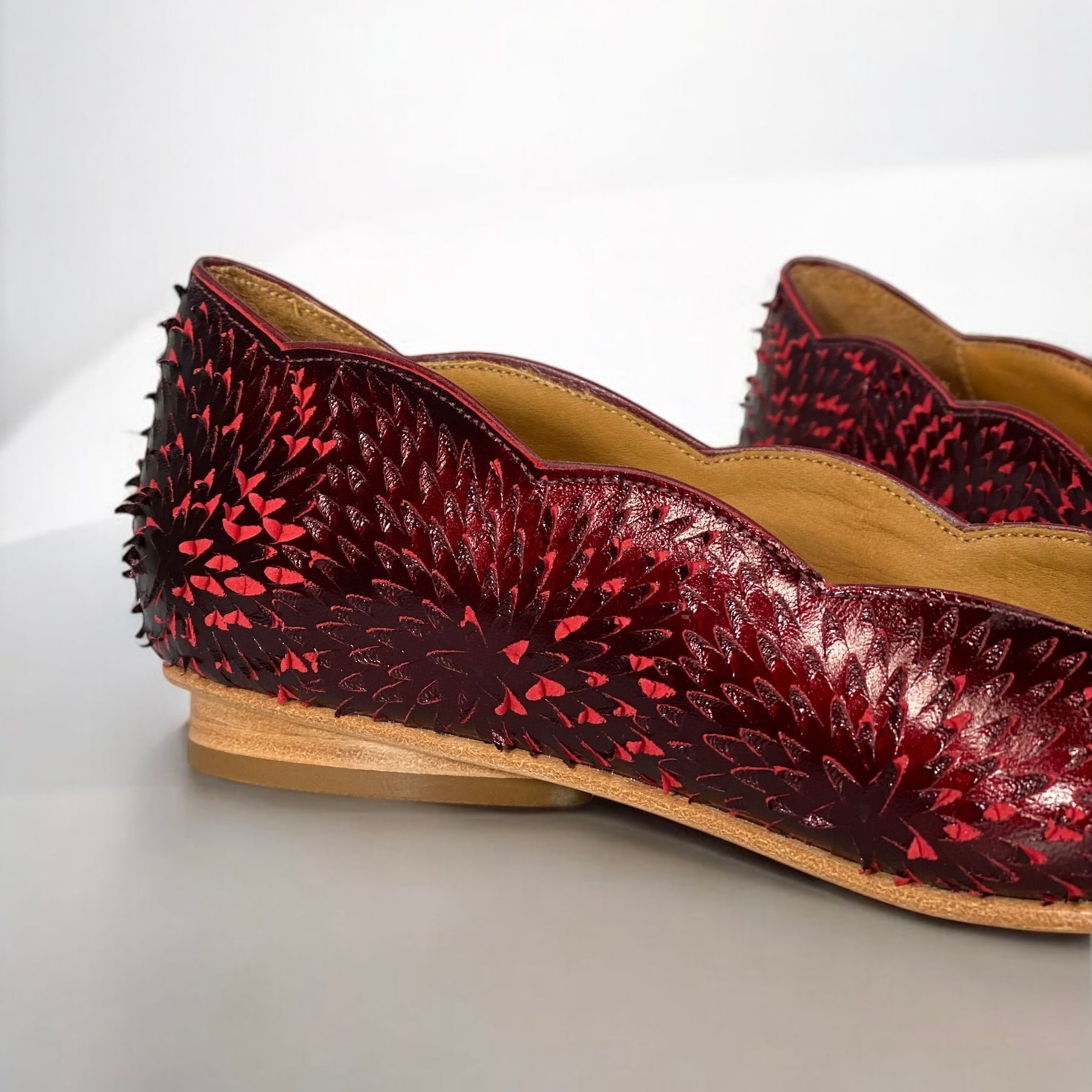 Cada par é desenvolvido artesanalmente, com couro especial e acabamento que muda com a luz.