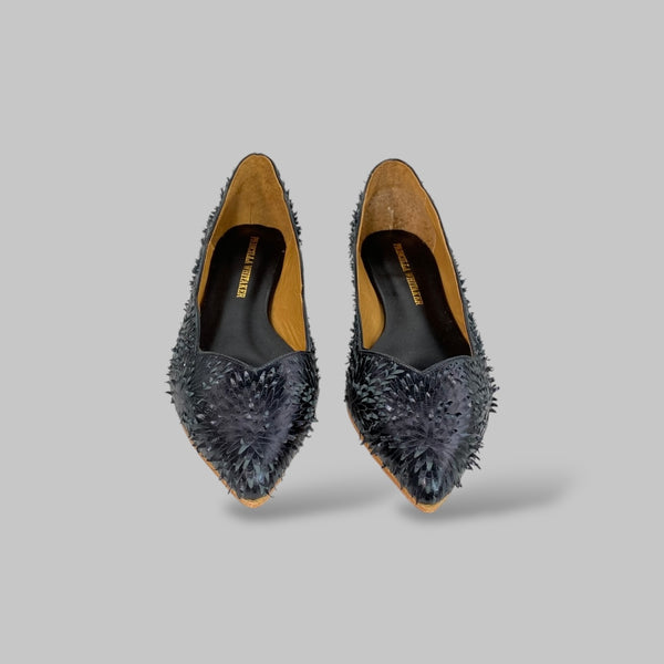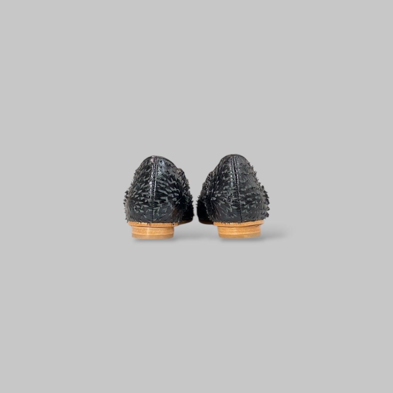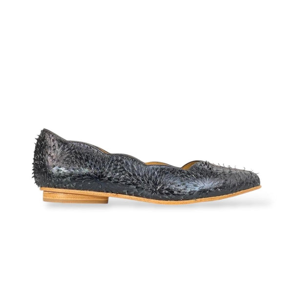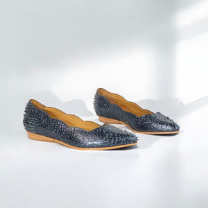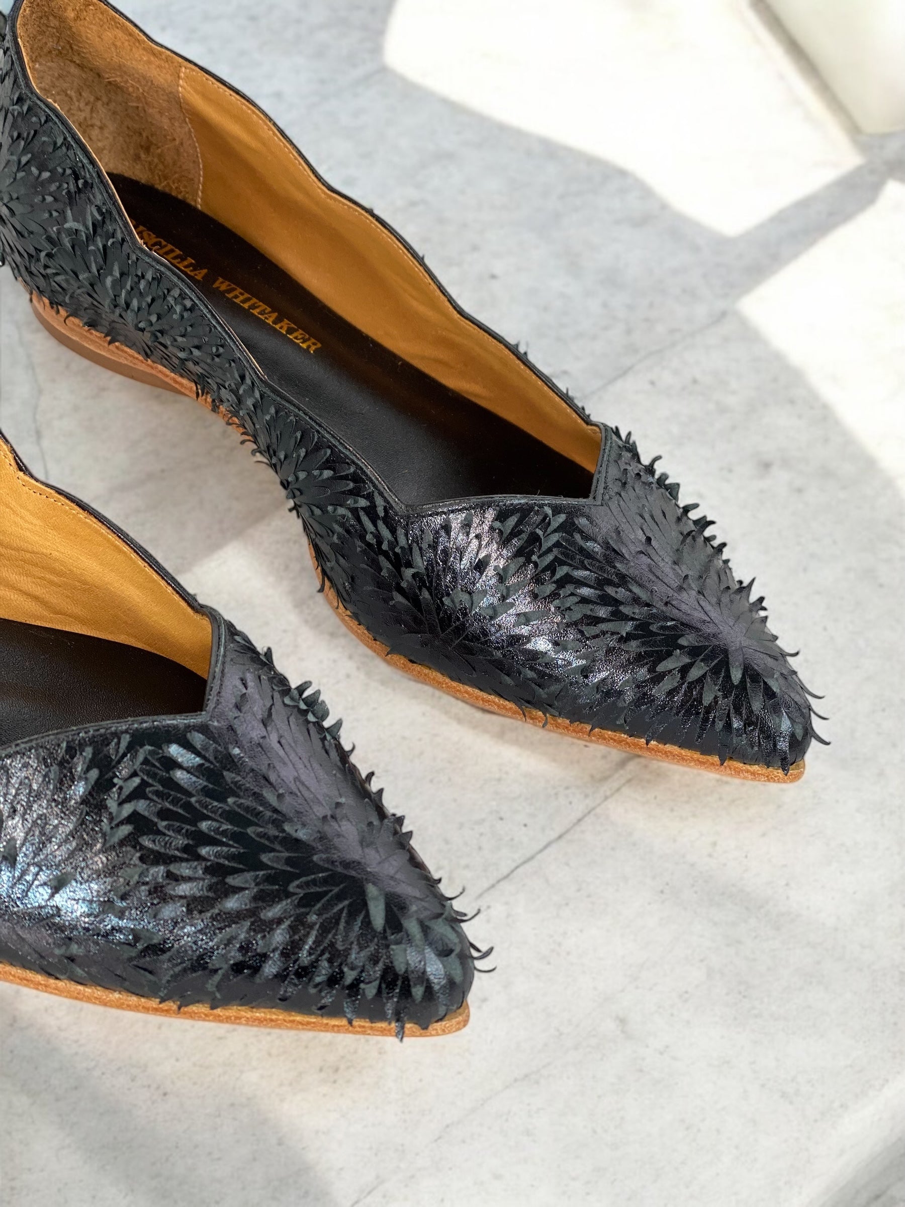 Feito com couro texturizado desenvolvido à mão, este modelo traz recortes delicados e brilho discreto que revelam sua beleza à medida que a luz toca.