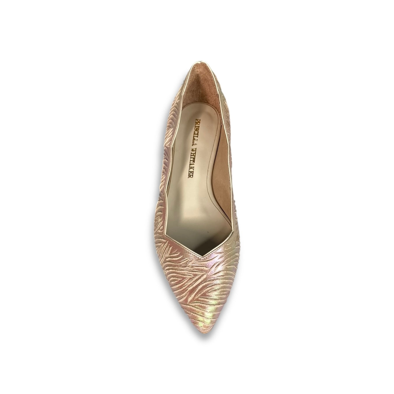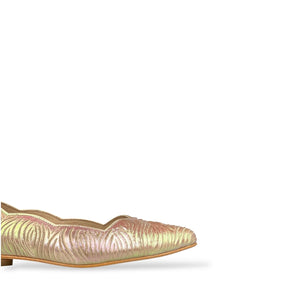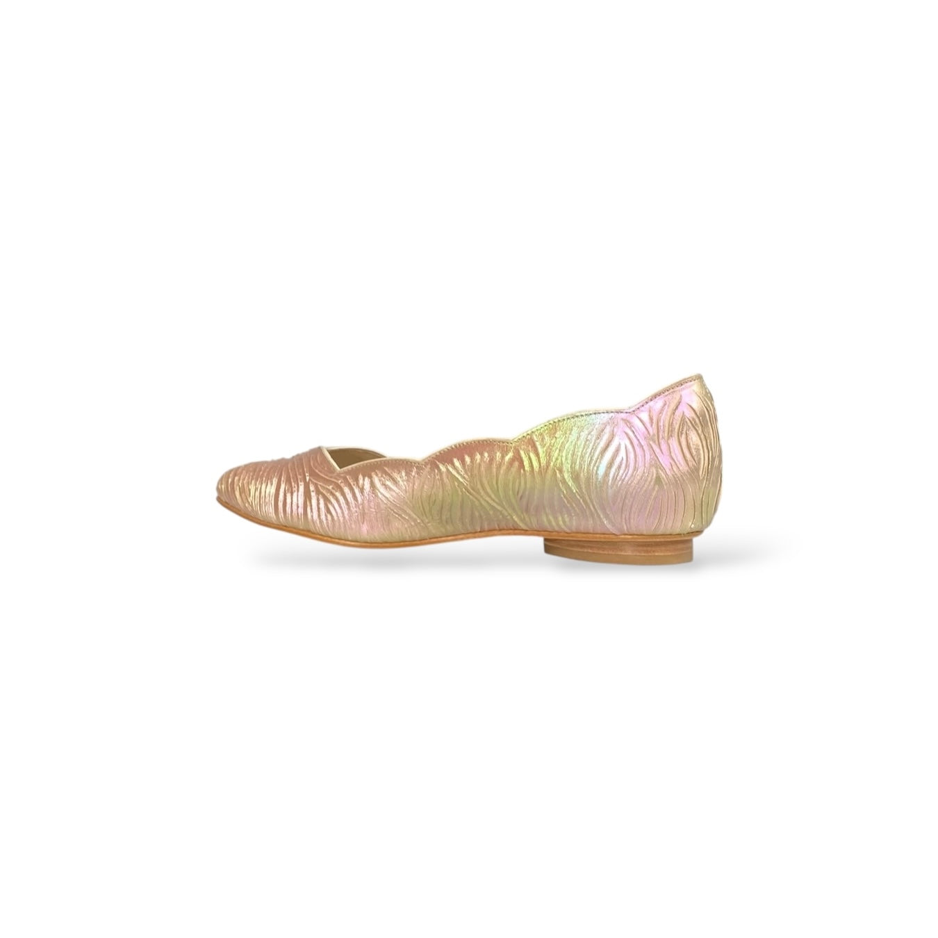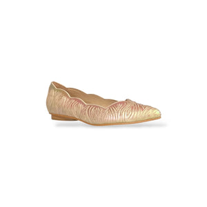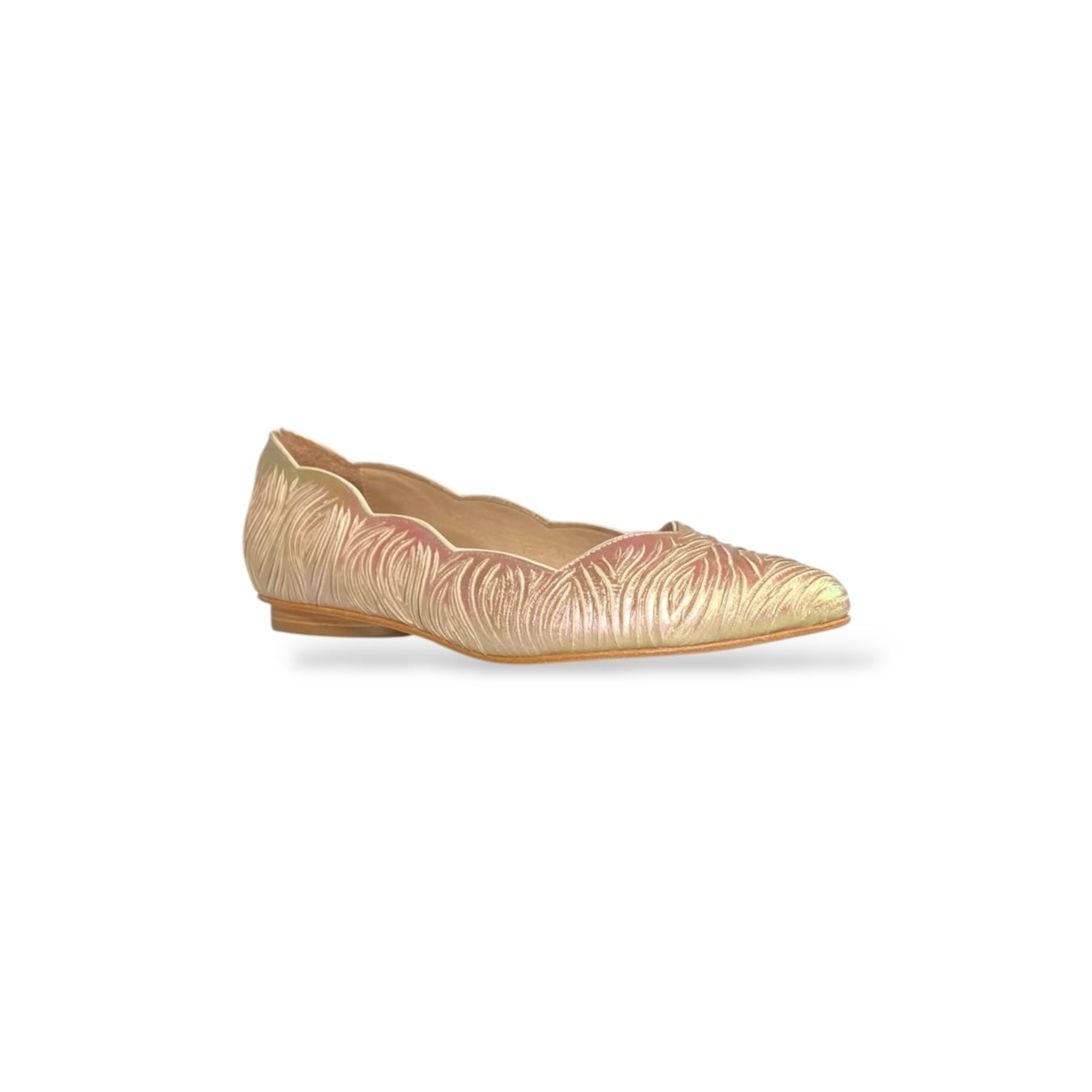 A sapatilha Tina traz um trabalho artesanal impecável, com textura em relevo que lembra delicadas ondas ou folhagens, criando um efeito elegante e cheio de movimento. O recorte ondulado nas laterais adiciona sofisticação e originalidade, enquanto o formato alongado do bico garante um visual moderno e versátil, perfeito para acompanhar produções do dia à noite com conforto e estilo.